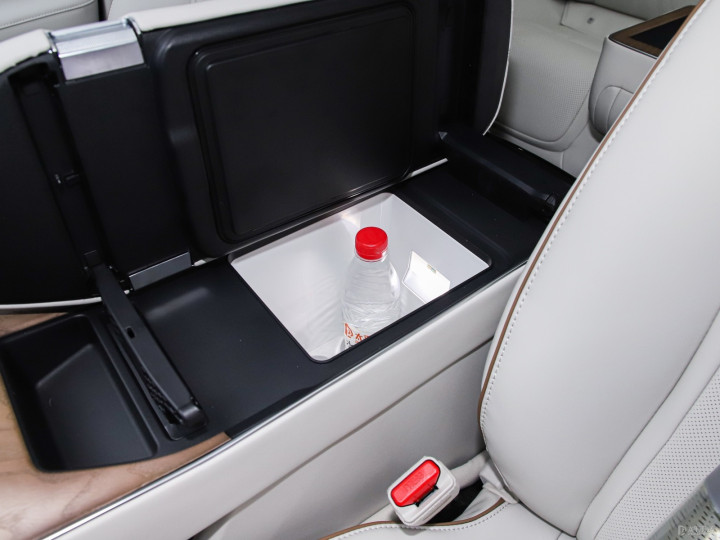 本次实拍车型前后座椅均搭载座椅加热、通风、电动调节和按摩功能。另外副驾靠背后方也有小桌板设计。而中央扶手处还设有冷暖冰箱(工作温度:2°-20°制冷 / 35°-50°制热。)