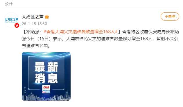 据@大湾区之声消息,香港特区政府保安局局长邓炳强今日(15日)表示,大埔宏福苑火灾的遇难者数量修订增至168人点金网,暂时不会公布遇难者名单。