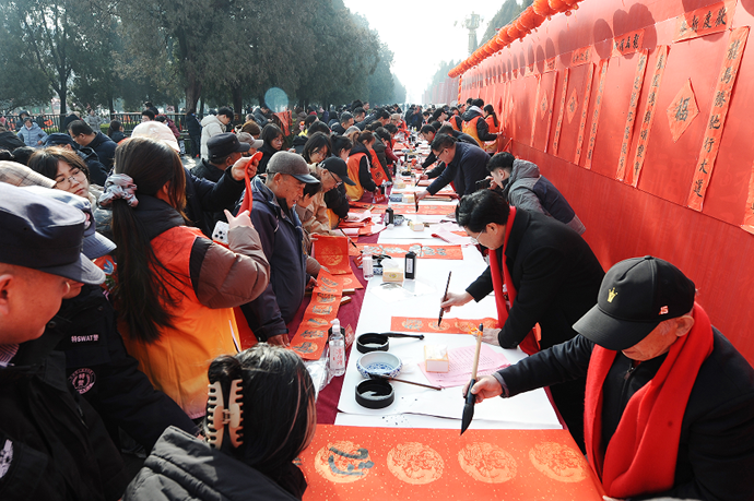 在曲阜万仞宫墙前广场,书法家与优秀青少年书法作者共同挥毫泼墨,为群众书写春联和“福”字。红纸墨香间,书家们以笔墨传递祝福,群众热情参与、有序领取,场面喜庆热烈。