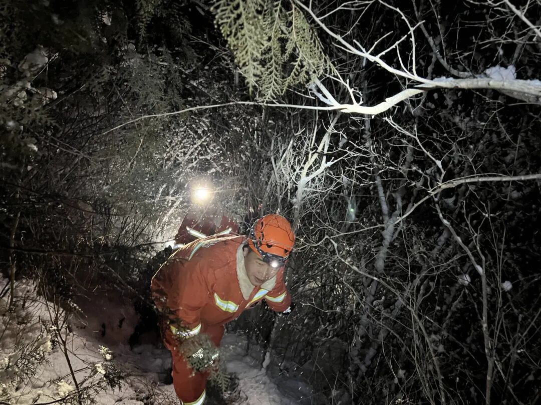 夜间,降雪还在增强,道路结冰湿滑,再加上两名被困者均存在受伤情况,营救工作十分急迫。