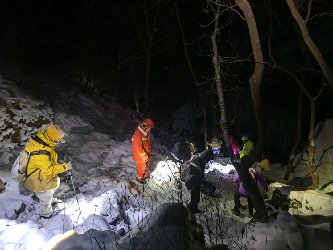 当天19时30分,北京119指挥中心再次接到驴友报警,被困者是一对夫妻,因大雪路滑摔下山崖,其中男子疑似肋骨受伤,无法移动,女子腰部受伤,尚可活动。