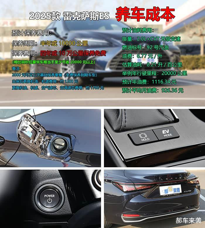 除了免费保养,低油耗自然也是雷克萨斯卖点之一,即使是纯燃油版也十分可观,郝哥以推荐配置为例,新车工信部综合油耗显示为6.21升/百公里,为了更接近真实,郝哥以再增加两个油计算,也就是8.21升,目前北京地区92号汽油的油价为6.77元/升,假如每年行驶20000公里,那么预计您的年油费为1116.34元,平均月油费为926.36元,不知道这样的油耗水平您还满意么?缺点是动力偏弱,适合比较佛系的消费者驾驶,以上所有数据均为郝哥粗略估算,仅供您购车时预算参考。