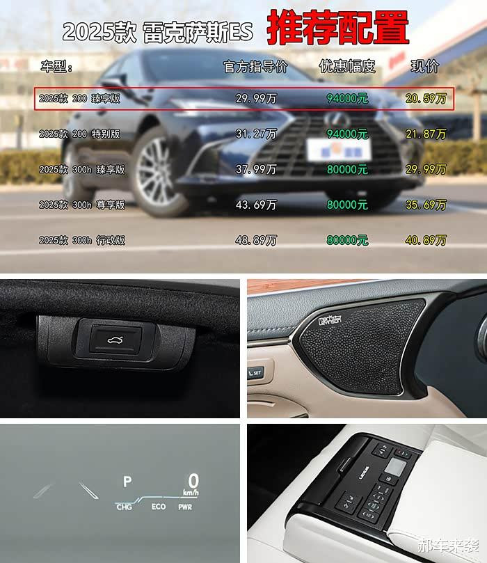 《郝车来袭》原创导购:众所周知,雷克萨斯的优缺点十分明确,优点是纯进口豪华品牌、皮实耐用、品质有保证、免费保养以及燃油经济性高等等,缺点是价格偏高、维修成本贵和动力偏弱。时至今日,随着进入新能源时代,曾经从不优惠的雷克萨斯终于也不得不在售价上进行妥协。近日,根据郝哥暗访北京地区某雷克萨斯4S店得知,目前2025款雷克萨斯ES共在售五款车型,售价区间为29.99万~48.89万元,当然这只是指导价,那么实际优惠幅度如何呢?推荐配置落地价得多少钱?养车成本又高不高?