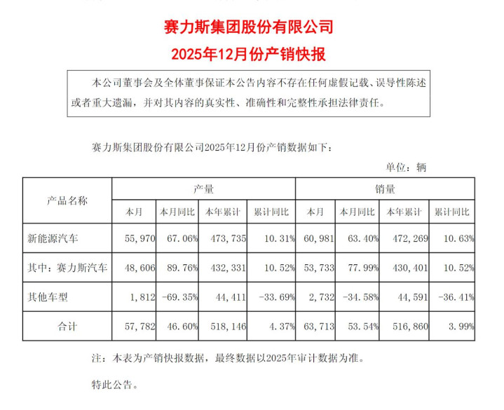 刚刚发布的产销快报显示,赛力斯2025年全年销量51.86万辆,其中赛力斯(问界)品牌43万辆,同比增加10.52%。