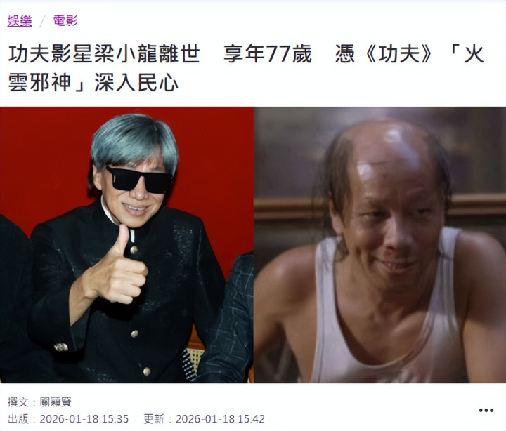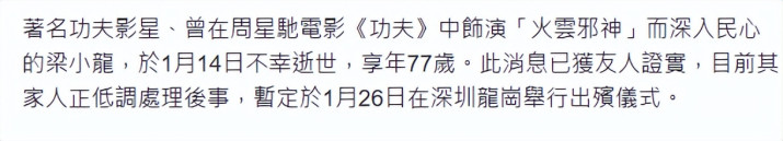 报道指出,梁小龙在1月14日不幸去世,消息已获得友人证实,目前家人正在处理后事,1月26日将在深圳举行告别仪式。