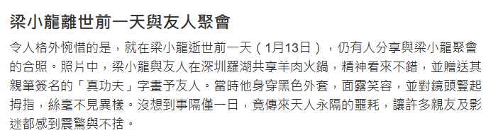 据港媒报道,梁小龙在1月13日曾与朋友一起在深圳吃火锅,当时还签名了字画送给朋友,精神状况不错,怎料会在次日传出死讯。