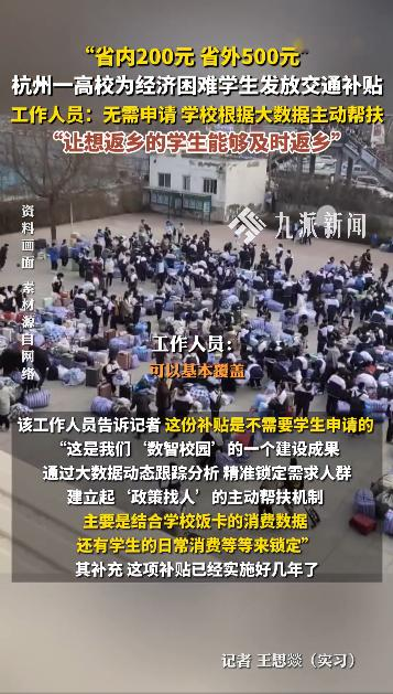 该工作人员告诉记者,这份补贴是不需要学生申请的,“这是我们‘数智校园’的一个建设成果,通过大数据动态跟踪分析,精准锁定需求人群,建立起‘政策找人’的主动帮扶机制。主要是结合学校饭卡的消费数据,还有学生的日常消费等等来锁定”。其补充,这项补贴已经实施好几年了。